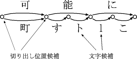 そこで、本稿では、文字認識率が低くても(人手によって修正することなく)全 文検索が可能な手法を提案する。通常の OCR では、ページイメージ(文書画像) をテキストに変換するが、本稿で提案する手法では、「文字ラティス」と呼ば れる形式[5]に変換する。文字ラティスの例を図1に示す。文字ラティスは、文 字切り出し/文字認識の仮説をラティス構造によって表現するもので、従来は、 言語知識を利用した文字認識後処理[6]に用いられていた。筆者らは、与えら れたキーワードを文字ラティス中から高速に検索する手法を提案し[7]、これ によって、全文検索可能な文書画像データベースシステムの構築を行った。こ のシステムによって「分散」というキーワードを検索した結果を図2に示す。