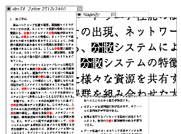 ディジタル図書館を実現するための重要な課題の一つに、過去から現在にいた る間に出版された膨大な数の図書・雑誌をいかにして効率よくディジタル化す るか、が挙げられる。文書のディジタル化には、ページイメージによるものと 全文テキストによるものとがある[2]。ページイメージは、スキャナによって 文書をビットマップイメージとして取り込んだものであり、作成コストが安く、 閲覧に向くという特徴を持つ。一方、全文テキストは、OCR を利用するなどし て文書をテキストとして表現したものであり、データサイズが小さく、検索に 向いている。しかし、現状の OCR の読み取り精度は十分なものではなく、そ の誤りを人手で修正して完全な全文テキストを得るにはコストがかかり過ぎる。 そのため、全文テキストのみを提供するといった形態は一般的ではない。