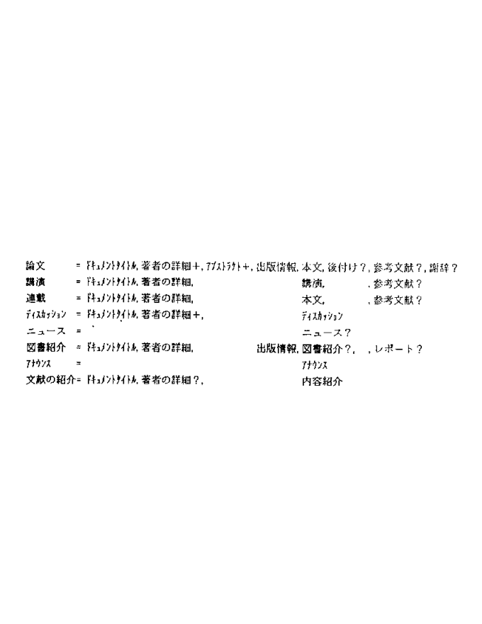 そこで、まず最初に、既に発行済みの3年分を取り上げ、収録されている記事の構造の分析を行った(図1)。「情報管理」誌の記事は、論文、講演、連載、ディスカッション、ニュース、図書紹介、アナウンス、文献の紹介の、8種に分類できた。これは、「情報管理」誌自体が、情報処理関連の技術等の論文をまとめた雑誌としての性格から、比較的容易に推測される。中でも、本誌の大部分を占める論文は、一般論文、講座形式の論文、講義の論文などがあり、比較的構造がはっきりしている。その他のものについては、やや形式に統一性が少なく、個別に構造をまとめた。
