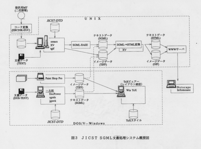 これらの検討を元にJICST DTDの開発を行い,データ入力・作成・編集作業のためのSGML文書処理システムの開発を行った(表1)。SGML文書処理システムは,大別すると「データ入力支援ツール」,「SGMLデータ生成処理」,「SGMLーHTML変換処理」で構成されている。図3にシステムの概要を示した。
