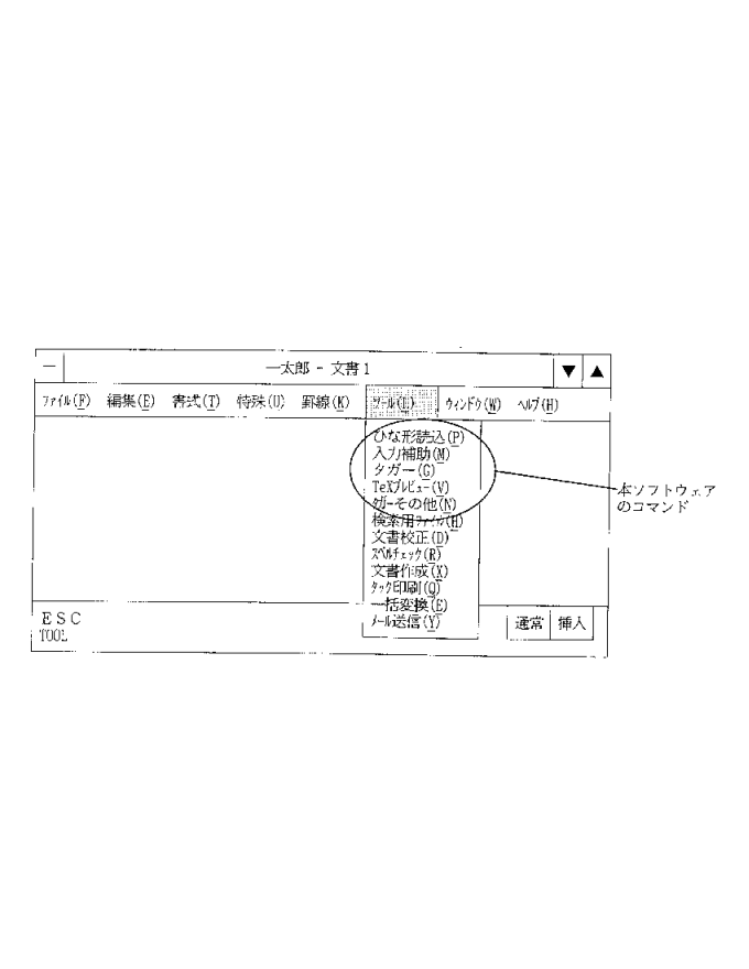 本ソフトをインストールすると一太郎の[ツール]メニューに,ひな形読込,入力補助,タガー,TeXプレビュー,タガーその他の5つのコマンドが割り付けられる(図4)。