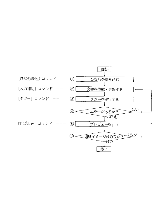 (1)「ひな形読込」コマンドでひな形を読み込む。その際,既存のDOSテキストの原稿があればそれを読み込むことができる(図6,7)。