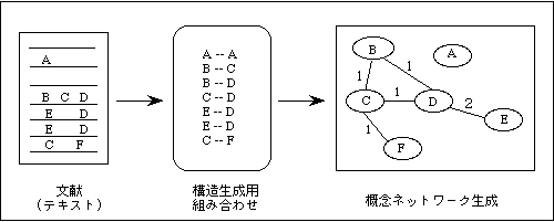 用語の抽出は、辞典の索引から作成した専門用語辞書(現在9,980語)[荒木 85]を使 う方法と、出現頻度の高い用語を自動的に抽出する方法を併用している。この方法によ って文献に表現されている重要な部分を、出現頻度だけに頼らないで取り出す可能性を 高めることができる。専門用語を抽出する場合、センテンスによっては組み合わせを生 成するために必要なものが含まれていないこともある。専門用語が一つのセンテンスか ら1つだけしか抽出されない場合は、本システムでは、そのまま2次元空間に単独でマ ップすることにしている。このような用語は、利用者が必要に応じて関連のありそうな 用語との間にリンクを形成し、概念ネットワークに組み入れることができる。生成され た概念ネットワークは、概念間のつながりを自動的に線分で連結し、利用者の自由な発 想を促すため、2次元空間にランダムにマップされる。図1は概念ネットワークの生成 過程を概念図で示したものである。
