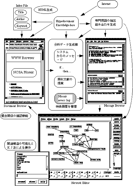 またこれまでの発想支援システムの開発では、発散的思考と収束的思考の支援に分け て考えられる傾向があったが[國藤 93][折原 93][杉山 93]、本システムの開発で は両方の支援を目標にした。発散的思考の支援は、考え方の幅を広げたり複数の解を得 ることの支援である。収束的思考の支援は、問題を限定して考えたり、事実やアイディ アをまとめることの支援である。また製品開発や科学的研究などさまざまな創造的活動 における新たな概念形成過程では、概念の中身に関わる内容刺激と発想のプロセスに関 わる刺激が共に必要になる[堀 94]。ユーザが必要とする文献を揃えて知識ベースを充 実させたり、ユーザが思い落としていたことに新たに気づかせるなどの支援は、内容刺 激になる。これに対して概念ネットワークを自由に操作し、ユーザの考えに基づいた概 念構造を組み立てるなどの支援は、プロセス刺激と言える。本システムの開発では、概 念ネットワークの自動生成と問題構造の可視化を効果的に機能させるため、これらの点 を考慮して次のようなシステムの諸機能を開発し、図2のようにNCSA Mosaic、Message Browser、Network Editorの中に組み込み、一体となった発想支援システムとして統合した [堀 97]。