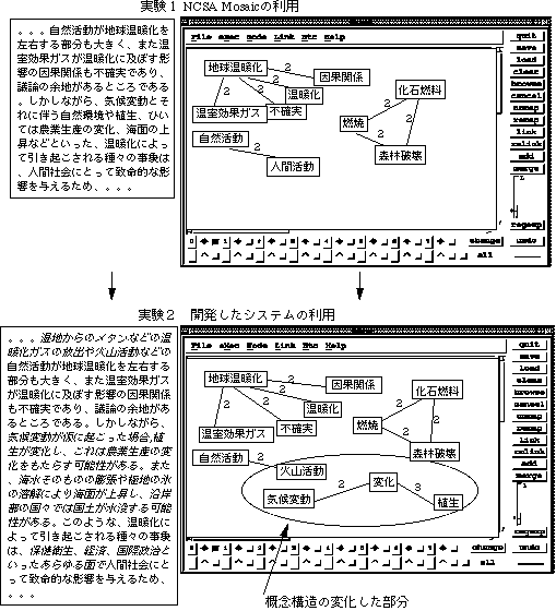 実験では「地球温暖化の原因とその対策について」という与えられた課題に対して、 自分の考えを仮説としてまとめることを被験者に依頼し、問題解決を行なう実験を行な った。最初に被験者はMosaicのみを使って、課題に対する仮説の作成作業を行い、回答を まとめる。その際に被験者に対して、実験は被験者固有の知的側面を調べるのではなく、 システムの性能評価が目的であり、自分で思ったことや意見を自由に、できるだけ書い てもらうように要請した。
