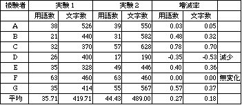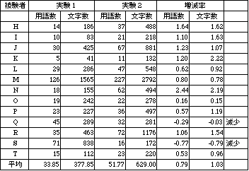 t検定は実験結果の全体的な有意差の判断に利用されるが、被験者個別の微妙な変化 を把握することは困難である。そこで後で触れる定性的分析にも利用するため、単純に 被験者ごとの実験1と実験2の用語数と文字数の増減率(実験1と実験2の増加分に対 する実験1の割合)を求めた。これらはそれぞれ表1、2の増減率の欄に示す値のよう になるが、増減率の数値的な増加傾向が現われているものに注目すれば、用語数では被 験者の61%、文字数では74%が増加傾向を示している。用語数と文字数から見ると、仮 説の文章が増加した被験者は全体の80%(20人中16人)に達する。