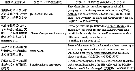 2つの実験をとおして被験者Eが作成した2つの仮説から、図6に示すように文章上の 変化では、「火山活動」が新たに追加された用語であるが、マップ上でも変更されてい ることがわかる。また「気候変動−変化−植生」の部分にあたる文章上の表現も修正さ れており、この部分は実験2でシステムを利用することによって、より重要性が増して いる部分ということが言える。