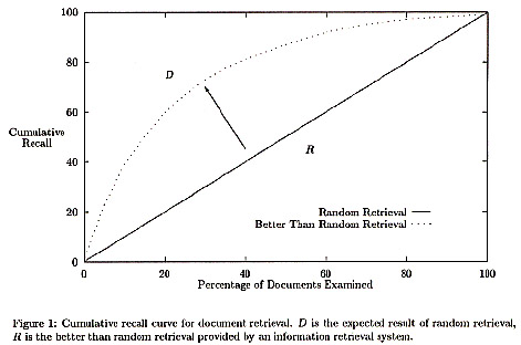 diagonal line D. Better-than-random retrieval yields a convex curve, R. With