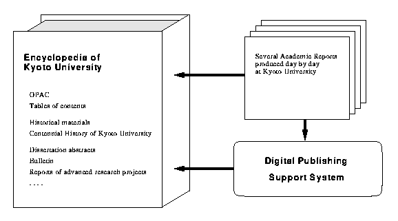 OPAC (1,000,000 entries by the year 2,000) Tables of contents (monographs and series) Centennial History of Kyoto University (7 written volumes and 1 volume of photographs) Dissertation abstracts (700 titles a year) Important Cultural Properties(35 items, 117 volumes) Treasure books, archival materials, maps, etc. |